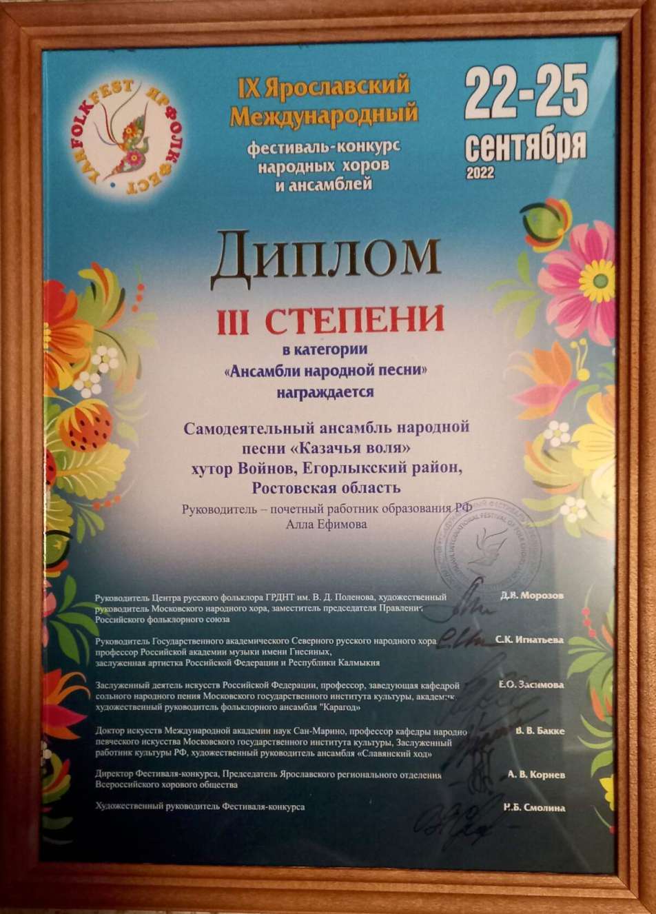 Над созданием искусственного спутника Земли в обстановке строгой секретности работали ученые М.В. Келдыш, М.К. Тихонравов, Н.С. Лидоренко, В.И. Лапко, Б.С. Чекунов и многие другие. Возглавлял работу Сергей Павлович Королёв. Поздравляем с днем запуска первого искусственного спутника Земли и началом Всемирной недели космоса ![]() ![]() ![]() Фестиваль «ЯРФОЛКФЕСТ» в г. ЯрославлеОпубликовано: 03-10-2022 07:0022-25 сентября в г. Ярославле проходил IX Международный фестиваль-конкурс народных хоров и ансамблей «Ярфолкфест». Наш ансамбль "Казачья воля" был приглашен на этот чудесный фестиваль! Концерты были организованы на площадках в Ярославле, Тутаеве, Гаврилов-Яме и Ростове. Мы выступали в г. Ростове Великом. ДЕНЬ ПЕРВЫЙ - 22 сентября 2022 Мы прибыли в г. Ярославль во второй половине дня...устроились в гостинице... А вечером состоялось открытие фестиваля-конкурса в ДК "Нефтянник" 36 коллективов из 18 регионов приехали показать свое творчество - из Москвы, Санкт-Петербурга, Челябинска, Костромы, Ярославля, Московской, Ленинградской, Ростовской (это мы), Свердловской, Костромской и др. областей. Как здорово и прекрасно все пели! Мы получили огромное удовольствие! Наш ансамбль исполнил старинную походную казачью песню "Как у нашей сотни..." ДЕНЬ ВТОРОЙ – 23.09.2022 Сегодня у нас был очень насыщенный день. С утра - пешеходная экскурсия по городу! Легенды, Волга и её приток Которосль, Храмы, город торгово-ремесленный, культурный центр, первый Театр, Некрасов, Ушаков.... и еще много интересного мы узнали сегодня! В 13:00 наш ансамбль приехал в радиостудию, где мы и рассказывали об ансамбле, казачестве, донском крае, пели казачьи песни...мы были приятно поражены тем, как ведущий программы построил разговор и как отлично он ориентируется в песнях различных казачьих ареалов (донские, ставропольские, терские, уральские....) Мы все вместе спели несколько песен А в 15:00 мы отправились в Ростов Великий на концерт...вместе с нами в концерте участвовали: детский фольклорный ансамбль "Жили-были" из Москвы и народный хор "Уральские россыпи".... Экскурсия по Ростовскому Кремлю запомнится надолго...нам, а наши песни ростовчанам (или ростовцам) ДЕНЬ ТРЕТИЙ - 24.09.2022 Сегодня - конкурсный день! Встали рано...девочки делали прически и макияж... гладили костюмы... В 10 часов мы были на сцене ДК "Магистраль". Звуковое оборудование высочайшего класса. (Спасибо организаторам). Наша номинация "Ансамбли народной песни", выступали мы под номером 6...спели казачью строевую "Как донские казаки..." а-капелла и "Узенький проулочек" в сопровождении баяна. Все сильно переживали.... Нашему солисту - Озерову Владимиру - было тяжелее всех, пришлось и играть, и петь, и танцевать! Мы справились!!!!! А вечером - дружественные посиделки... ДЕНЬ ЧЕТВЕРТЫЙ, ЗАКЛЮЧИТЕЛЬНЫЙ – 25.09.2022 Сегодня подведены итоги конкурса.... Наш самодеятельный ансамбль народной песни " Казачья воля" получил диплом Лауреатов конкурса III степени! Ура! Коллеги, вы МОЛОДЦЫ! ПОЗДРАВЛЯЮ! Творческих вам побед и успехов! Организаторам конкурса - низкий поклон! Ярославль, до свидания! Мы полюбили этот город с тысячелетней историей! Спасибо нашим спонсорам и друзьям за возможность побывать на IX Ярославском Международном фестивале конкурсе народных хоров и ансамблей - Осипову Э.З., Грановскому П.С., Халилову З.Н., Васильченко Э.А., Гетманскому О.В., Гончарову В.В. ![]() ![]() ![]() ![]() ![]() ![]() ![]()