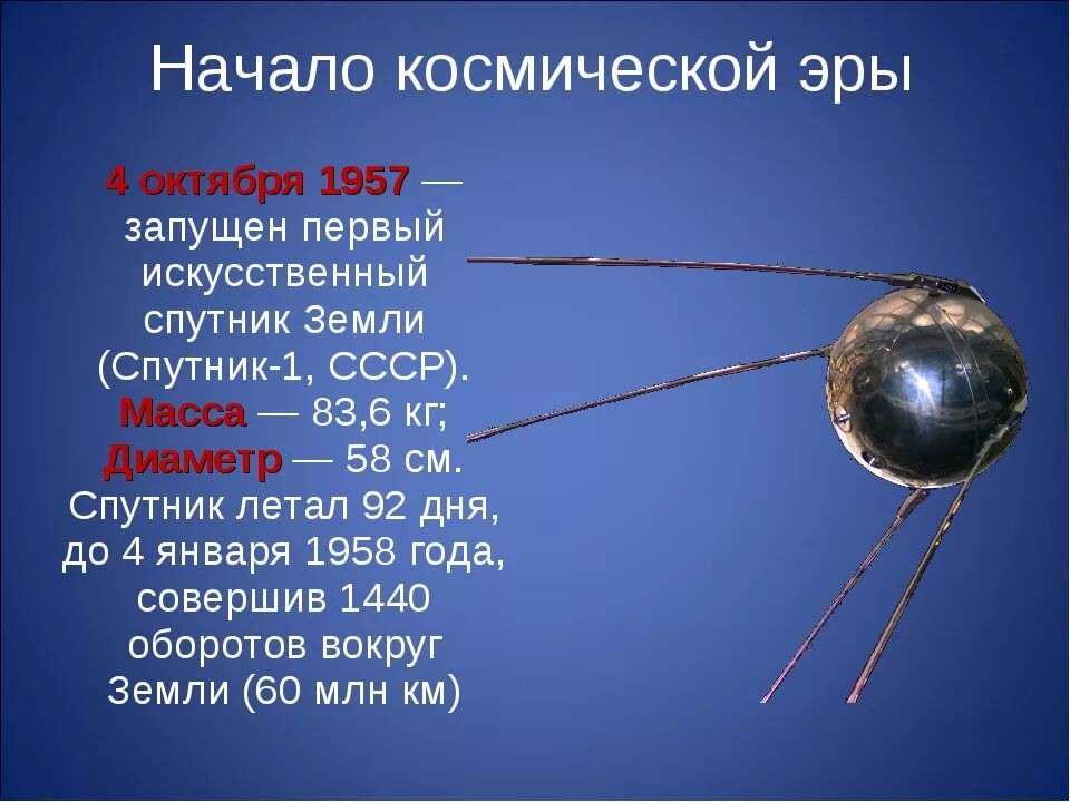 4 октября 1957 года в 22 часа 28 минут 34 секунды был запущен первый в мире искусственный спутник Земли, открывший космическую эру в истории человечества.