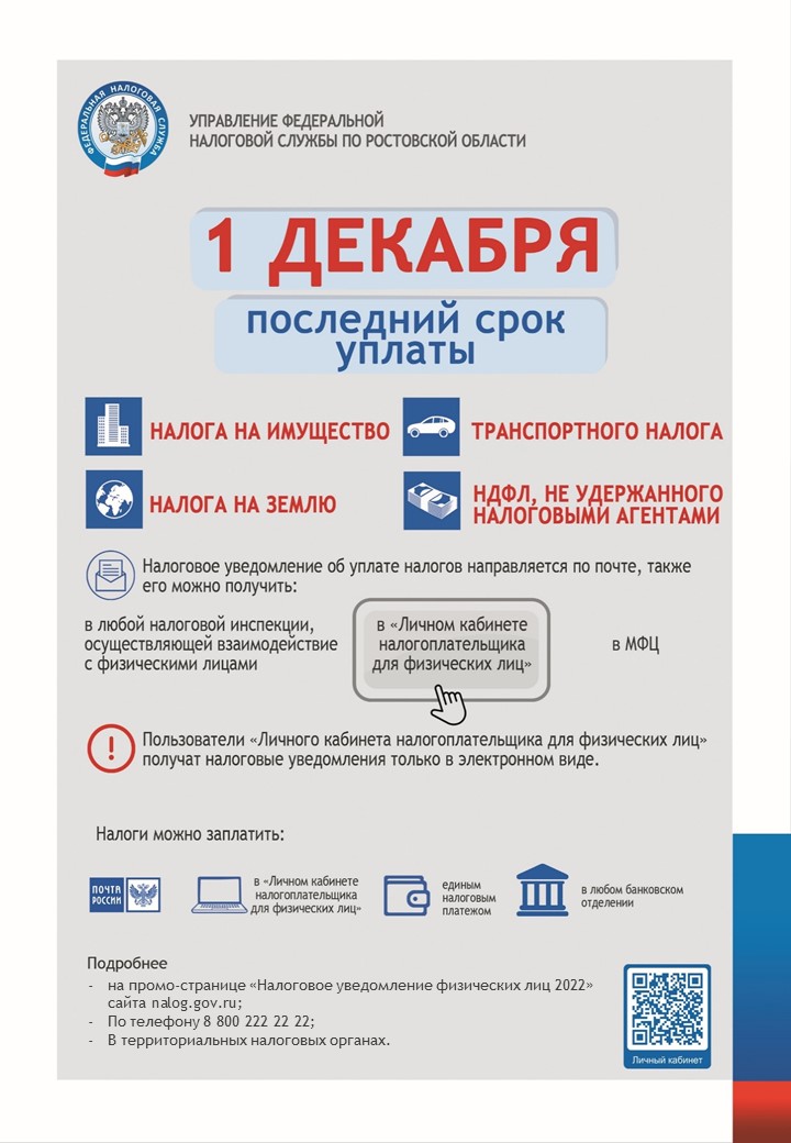 Уплатить налоги не позднее 1 декабря 2022Опубликовано: 07-10-2022 21:00![]() Срок уплаты транспортного, земельного налогов, налога на имущество физических лиц и налога доходы физических лиц, не удержанного налоговым агентом, за 2021 год истекает Уведомление на уплату налогов направляется в электронной форме через интернет-сервис «Личный кабинет налогоплательщика для физических лиц». Лицам, не имеющим доступа к этому сервису, - на бумажном носителе через отделения почтовой связи «Почта России». Если общая сумма налогов составляет менее 100 рублей, уведомление не направляется. По вопросам налогообложения можно воспользоваться Информация о ставках и льготах по транспортному, земельному налогам и налогу на имущество физических лиц размещена на Интернет-сайте ФНС России (https://www.nalog.gov.ru/rn61/service/tax/). По вопросам кадастровой стоимости объектов недвижимости обращаться в Федеральную службу государственной регистрации, кадастра и картографии (Росреестр) (https://rosrestr.info/kadastrovaya-karta). Способы уплаты - через платежные терминалы и банкоматы отделений банков, сервисы «Личный кабинет», «Заплати налоги» на сайте Федеральной налоговой службы www.nalog.ru, а также в отделениях «Почта России». График работы налоговых инспекций: •понедельник, среда – с 9.00 до 18.00; •вторник, четверг – с 9.00 до 20.00; •суббота (2 и 4-я каждого месяца) – с 10.00 до 15.00. Бесплатный телефон контактного центра ФНС России Контакты инспекций: https://www.nalog.gov.ru/rn61/apply_fts/. ОМВД России по Егорлыкскому району информируетОпубликовано: 07-10-2022 20:00