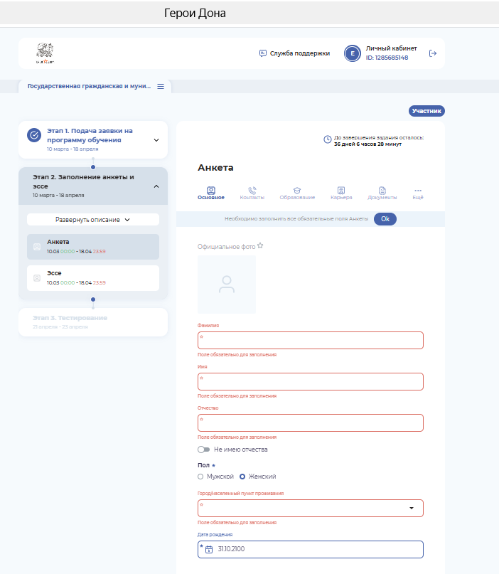 В анкете необходимо указать основные (личные) данные о себе, сведения ![]() Одновременно с заполнением анкеты потребуется прикрепление скан-копий или фото следующих документов: разворота паспорта с фотографией, диплома